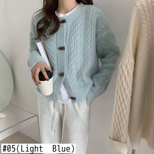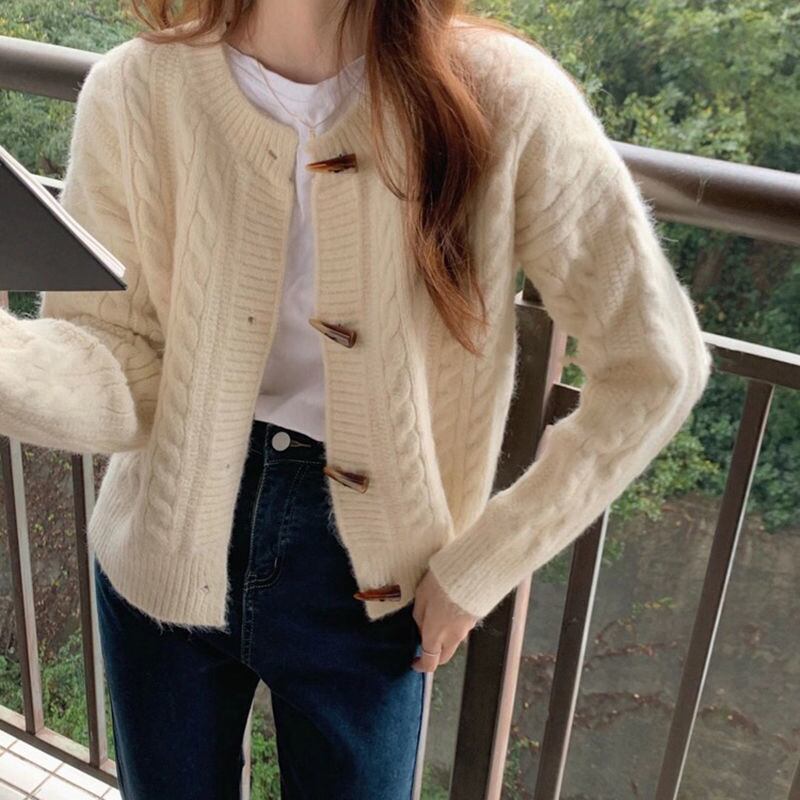 女性の秋の O ネック ニット カーディガン長袖セーター トップ ホーン ボタン ツイスト ニット カーディガン ショート スリム暖かいコート ロング オータム 秋物 Oネック