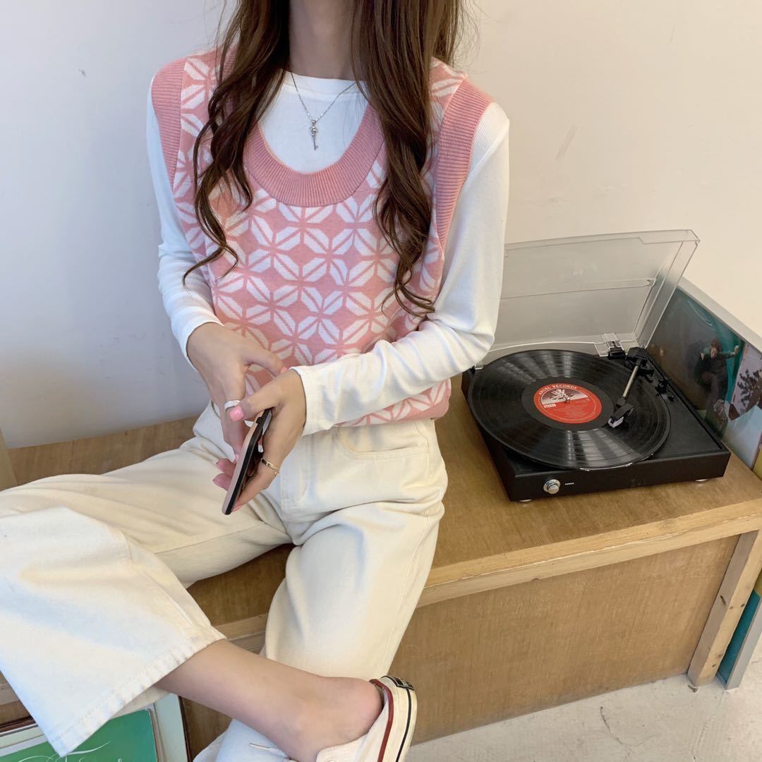 女性の秋冬レトロなアーガイル チェック カラー V ネック ノースリーブ セーター ベスト ルーズ怠惰なチョッキ ニット プルオーバー オータム 秋物 ウィンター 冬物 Vネック