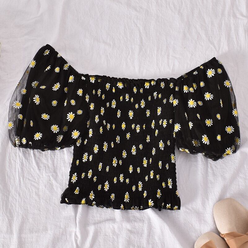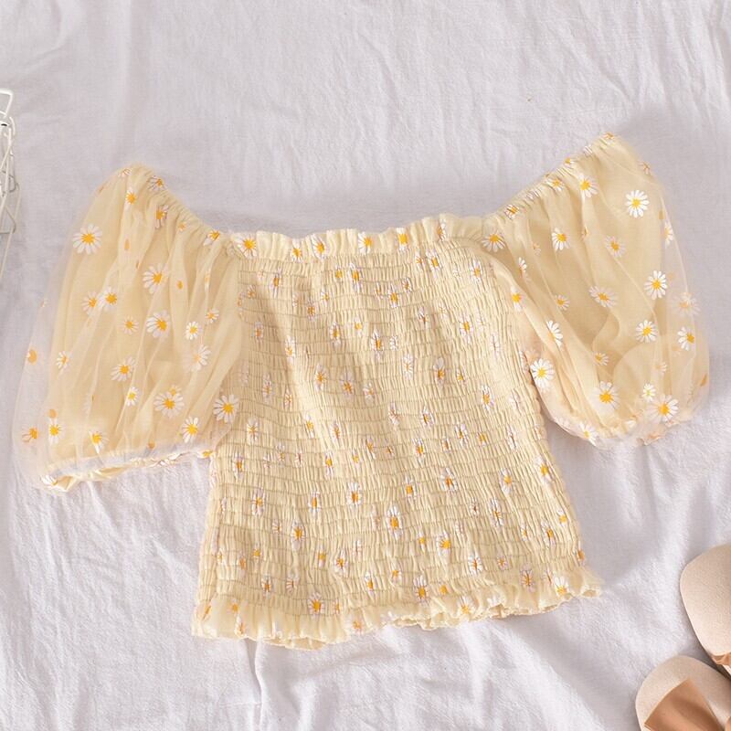 夏プリーツ花柄シフォンブラウスパフスリーブスラッシュネックセクシーな甘い露出へそショートシフォンブラウストップス 大人ガーリー スウィート キュート カジュアル サマー 夏物