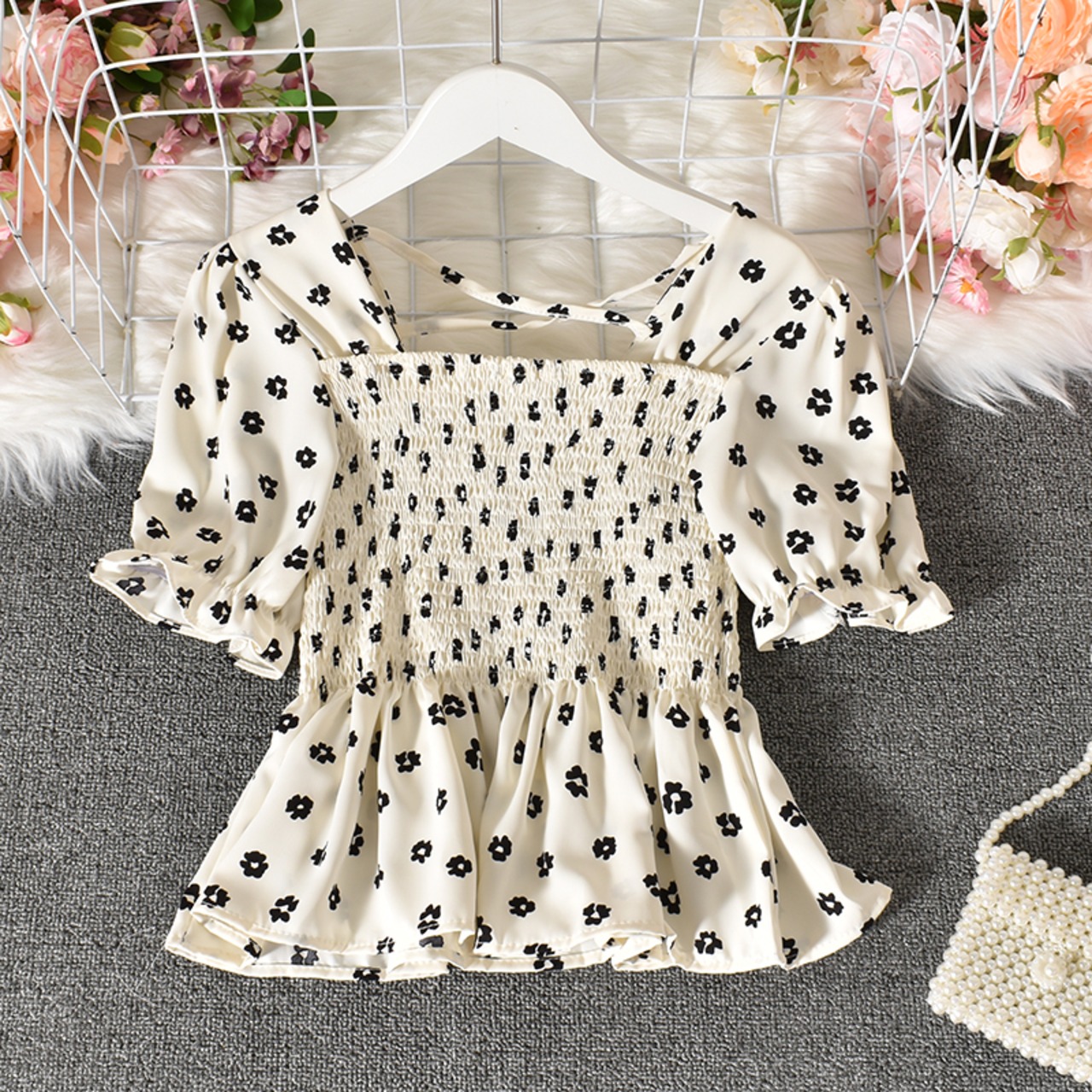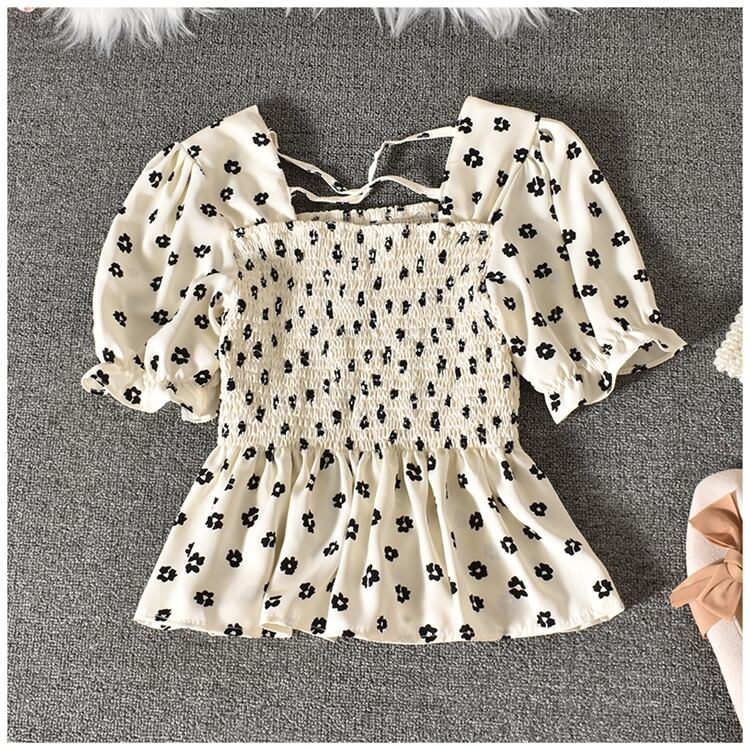 2021 夏パフスリーブシャツ花柄スリムスクエアネックホルタートップ女性つ折りフリルビーチショートシャツトップ サマー 夏物 スクウェア