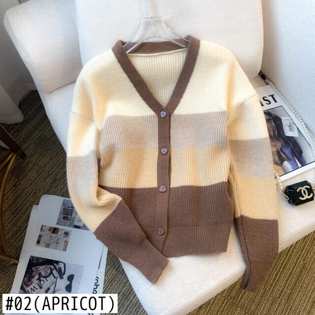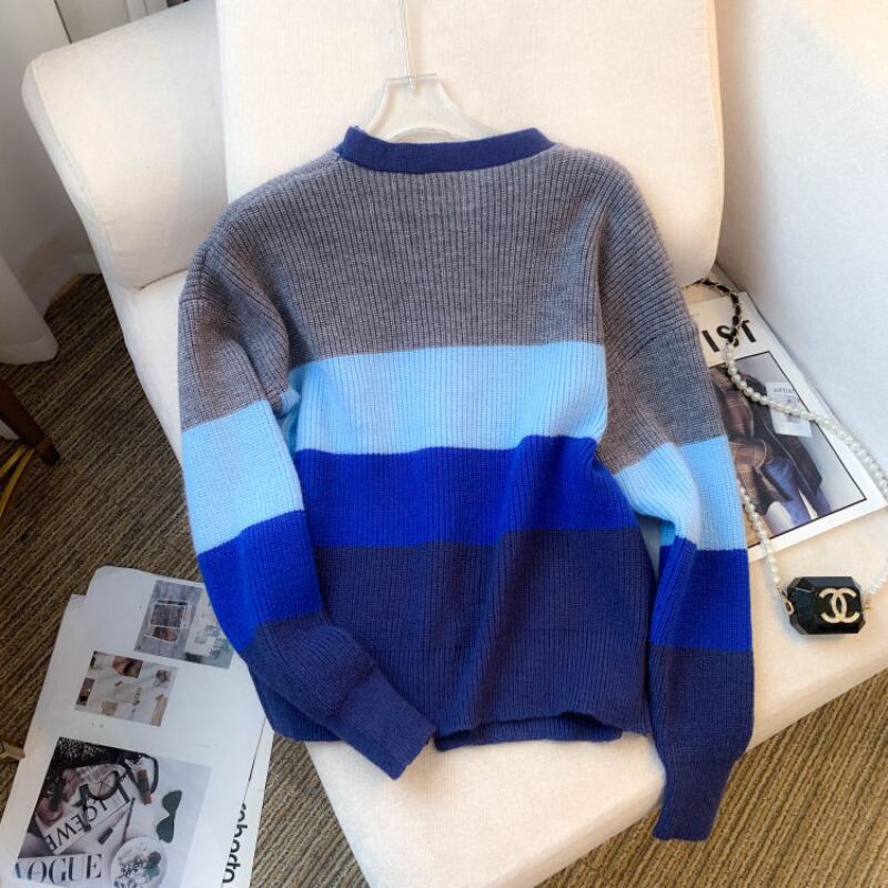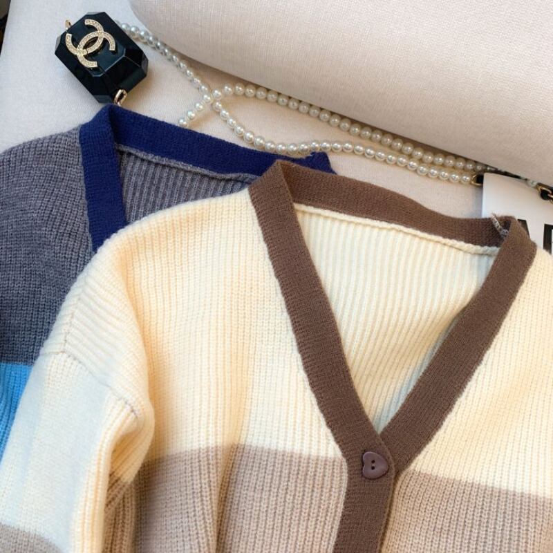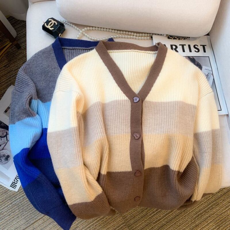 V ネックボタンセーター秋冬ストライプカーディガンセータールーズコート長袖トップ服 ロング ウィンター 冬物 Vネック
