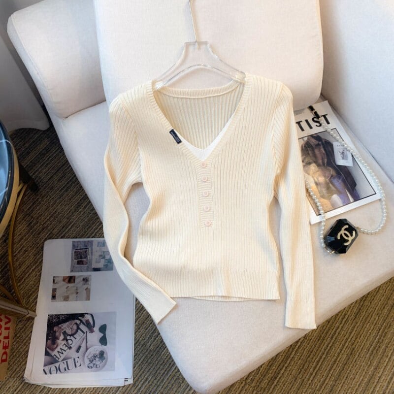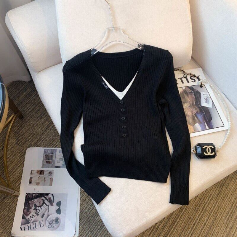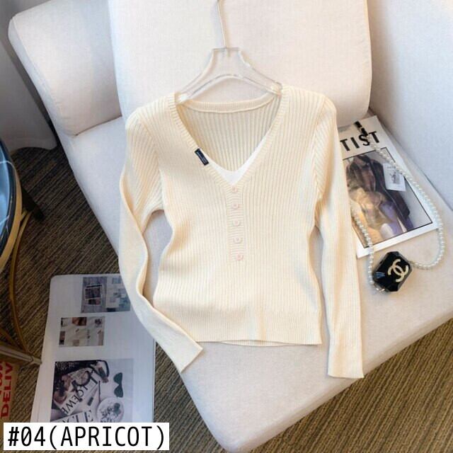 長袖 Tシャツスリムフェイクツーピースニットトッププルオーバージャンパーセーター ロング