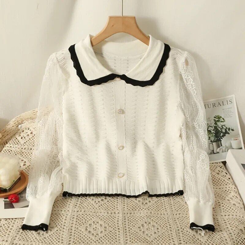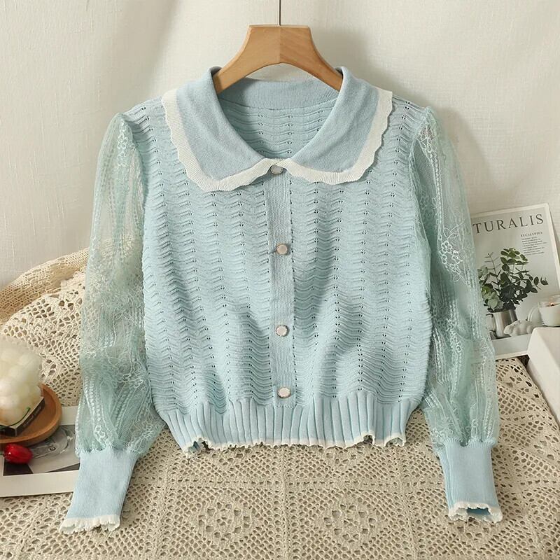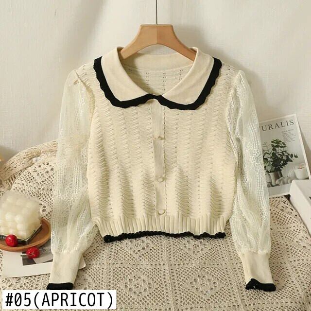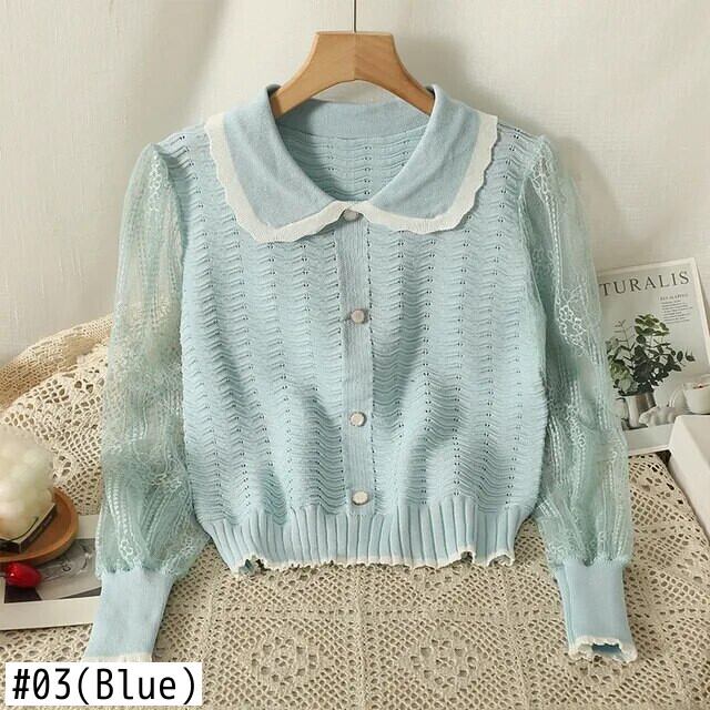 秋レースドールカラーシフォンステッチニットカーディガンパフスリーブトップセーター オータム 秋物